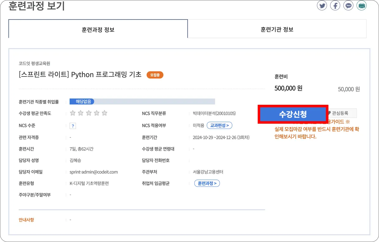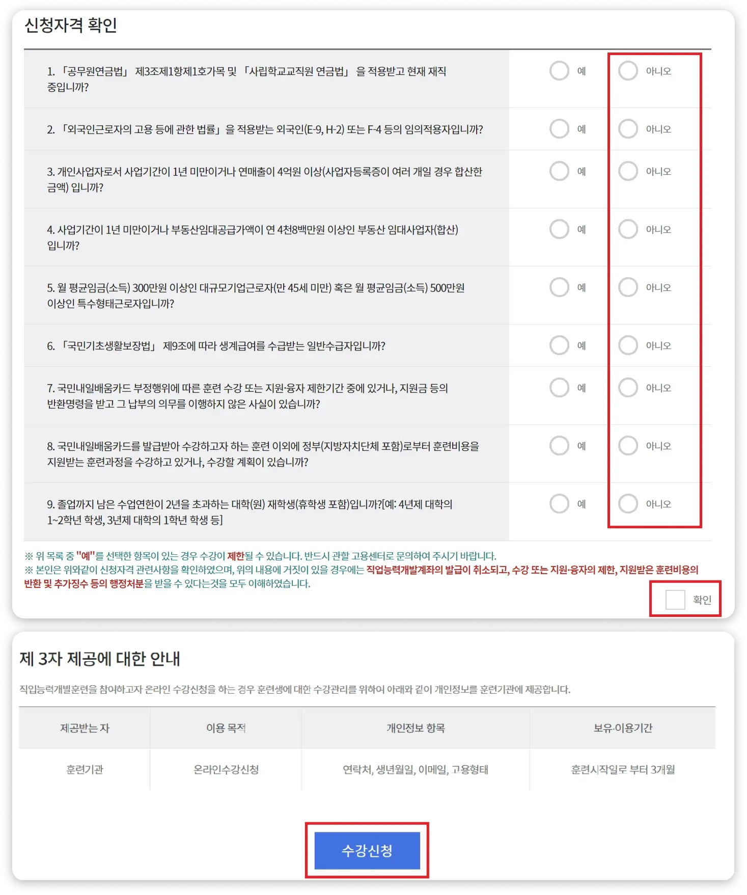 유의사항에 동의한 후, 수강 신청 정보와 신청 자격을 확인해주세요.