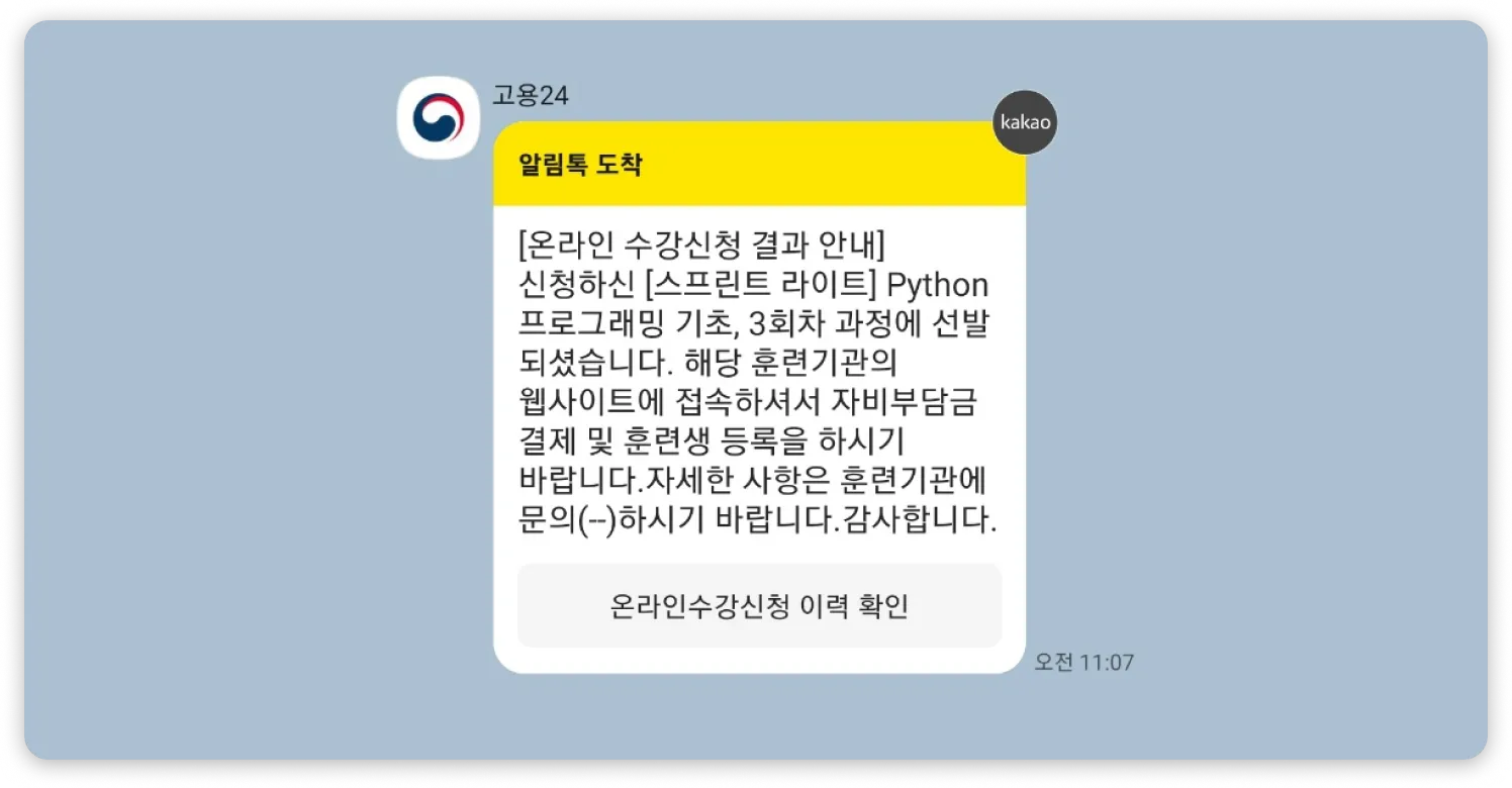 수강 신청 후 선발이 완료되면 카카오톡 알림톡이 발송되며 수강 신청이 완료됩니다.