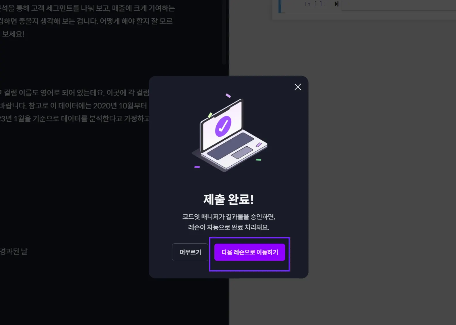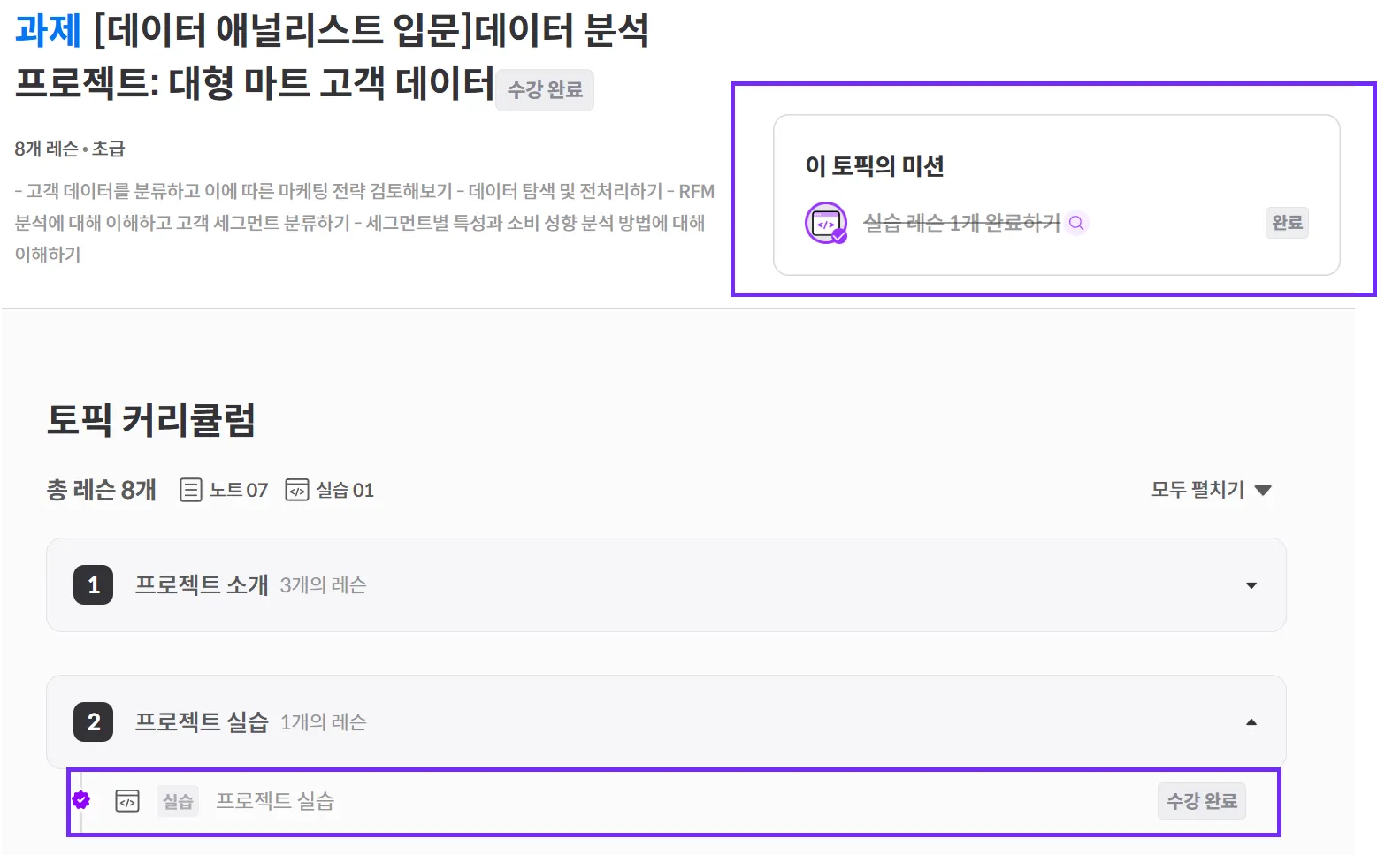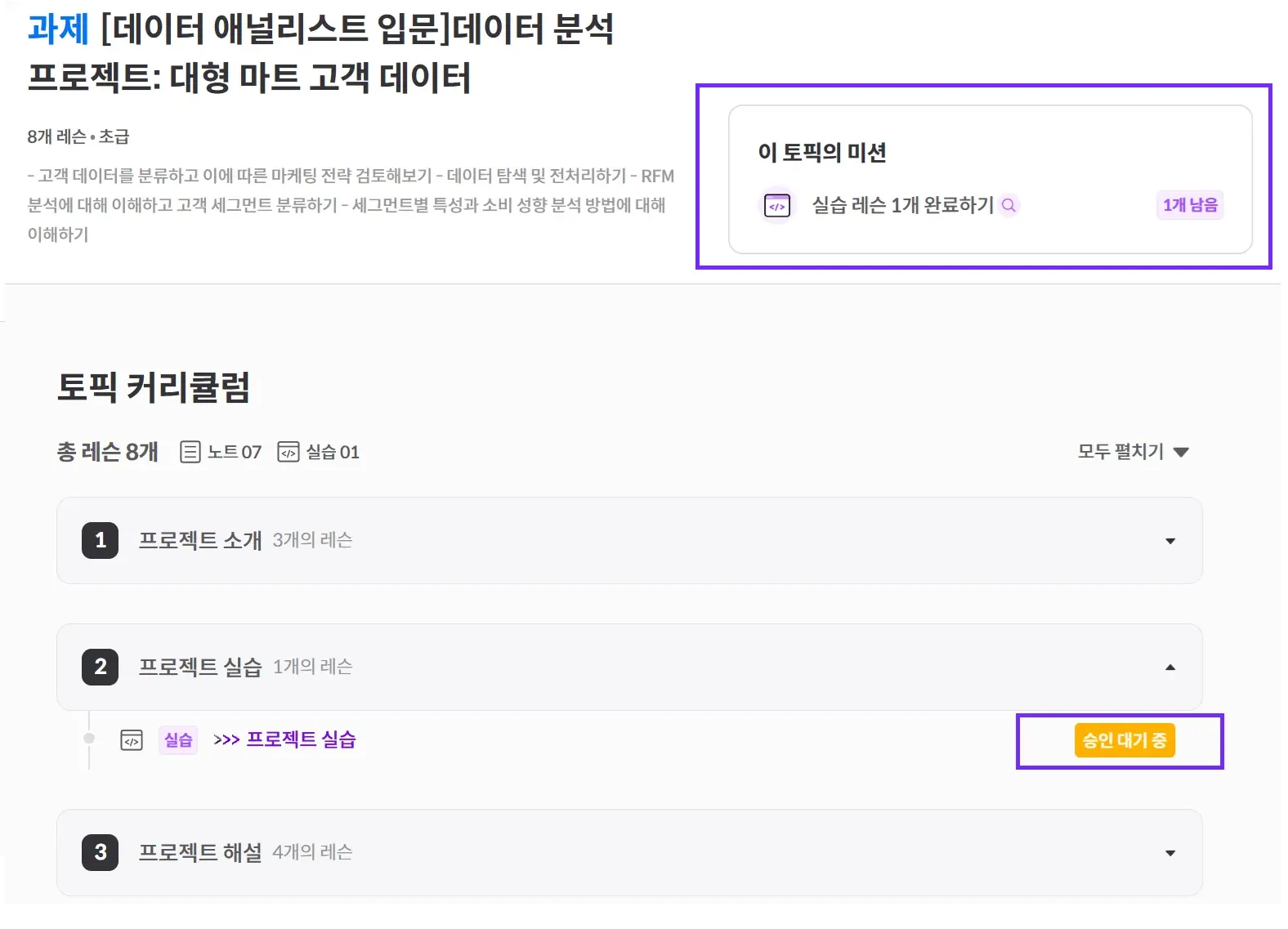 제출한 과제가 승인 처리 되면 “수강 완료 및 미션”이 완료 됩니다.