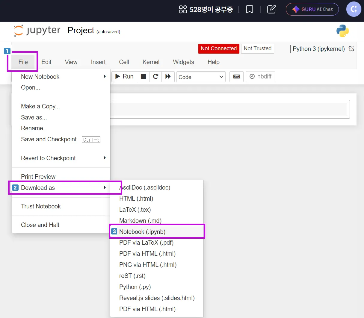 File → Download as → Notebook(.ipynb) 파일로 추출 후 저장하기