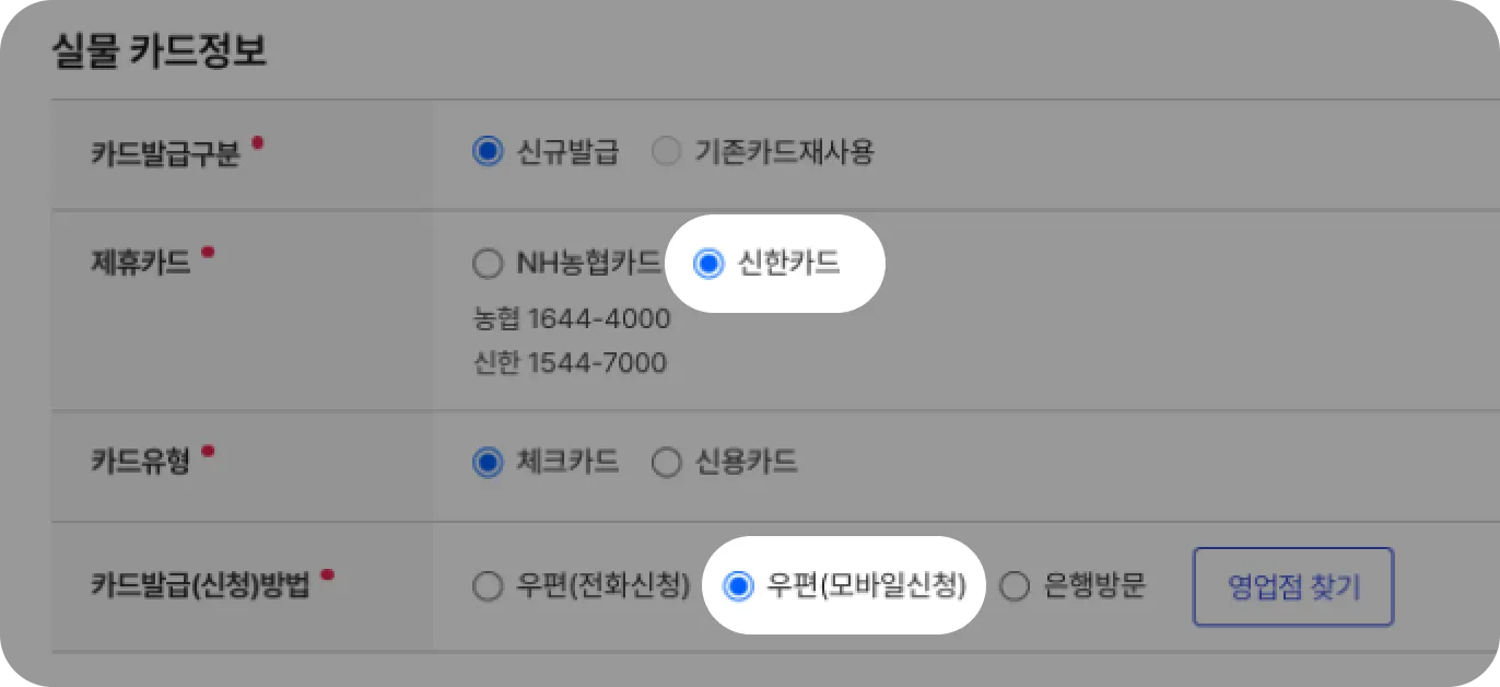 카드 정보에서 신한카드, 우편(모바일 신청)을 선택해 주세요.