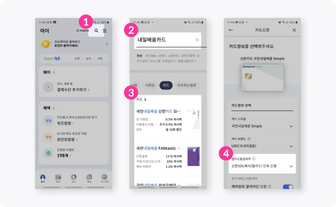 앱 설치 후 아래의 순서로 원하는 카드를 선택하고 발급 신청을 해주세요.