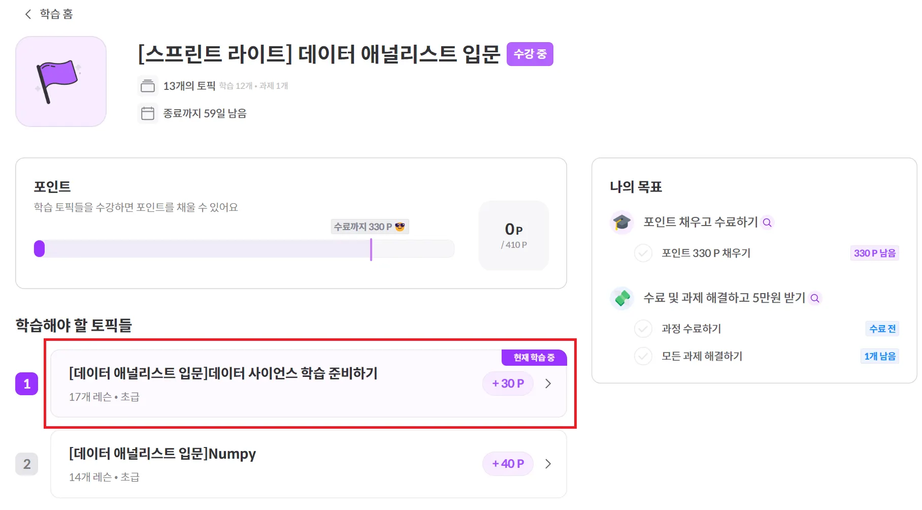 나의 목표에 기재되어있는 수료 포인트를 획득하면 수료입니다.